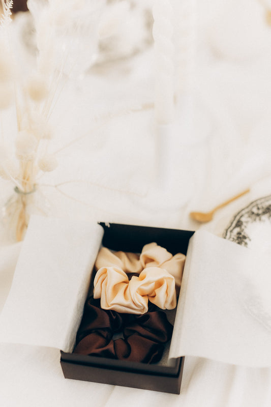 Set of 2 L size natural silk scrunchies - cappuccino beige & golden palm