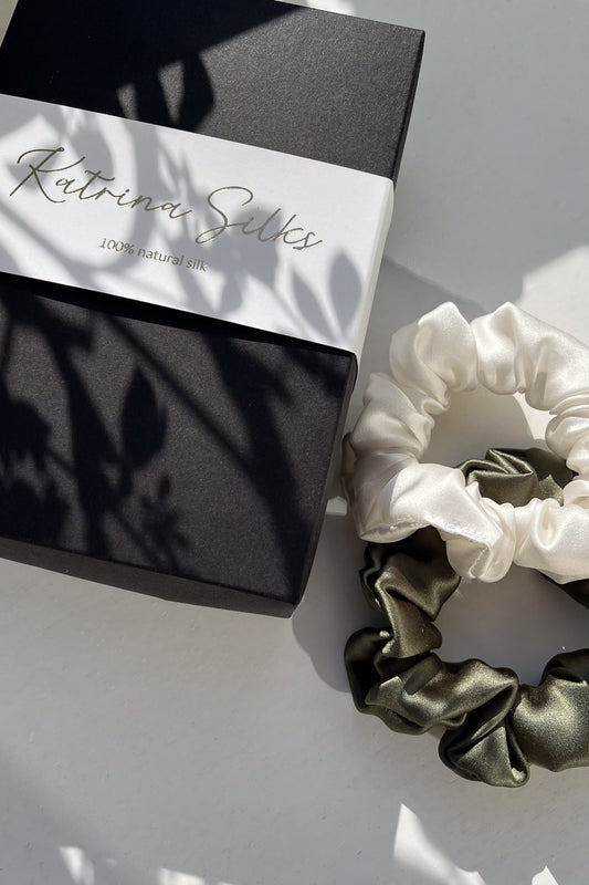 Set of 2 M size natural silk scrunchies - vineyard green & white pearl