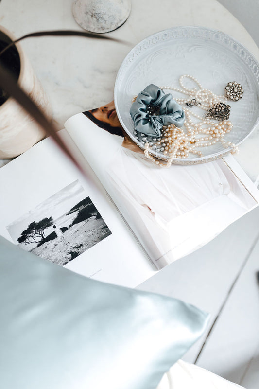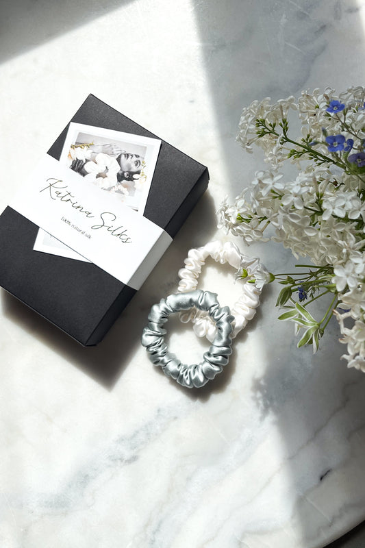 Set of 2 natural silk scrunchies - White Pearl & Misty Blue I S size