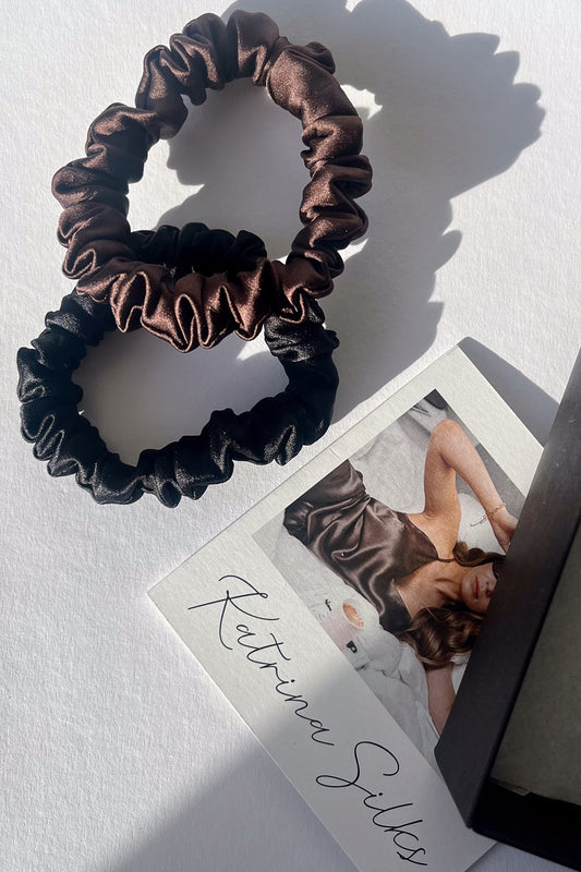 Set of 2 natural silk scrunchies - Chocolate Brown & Black Night I S size