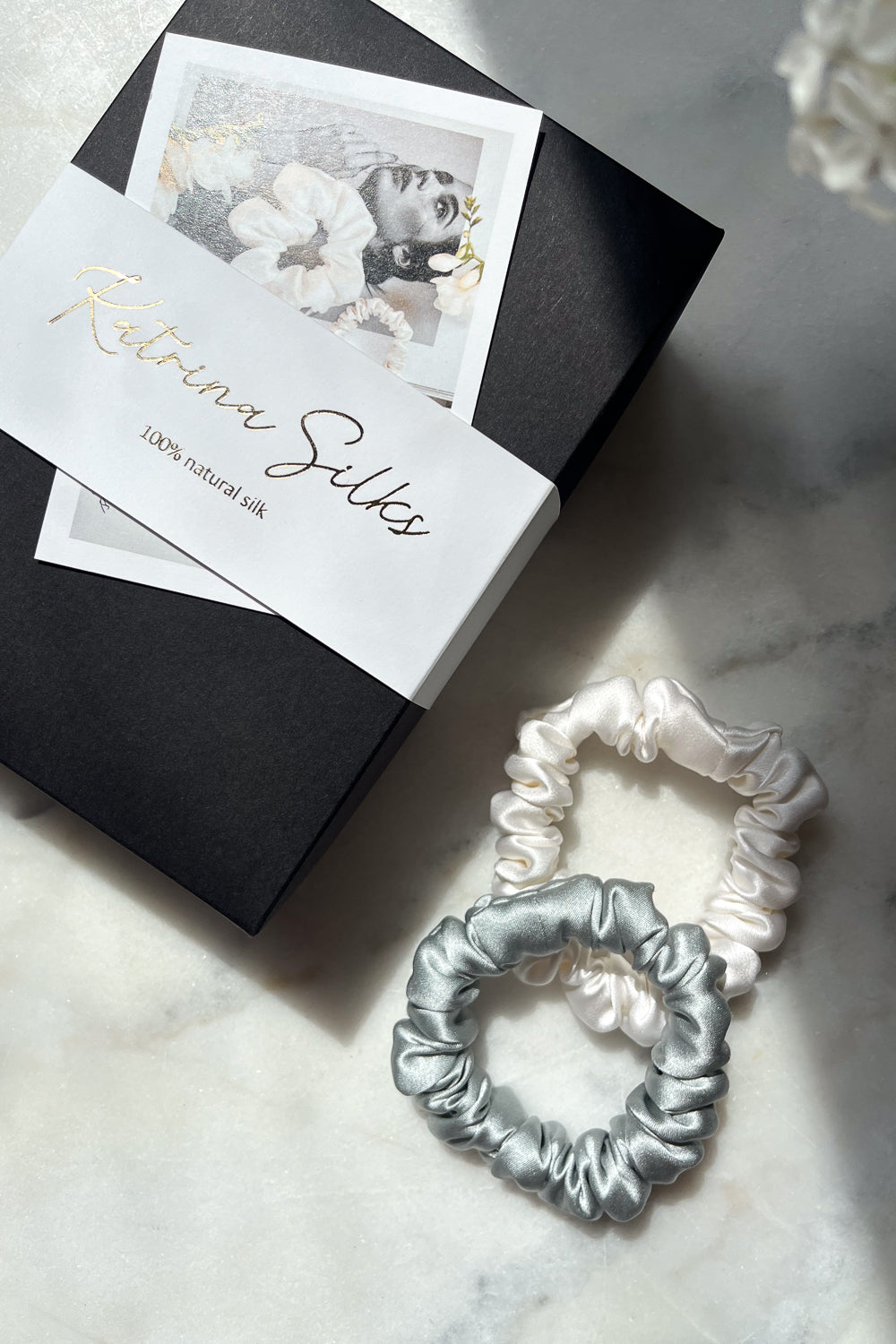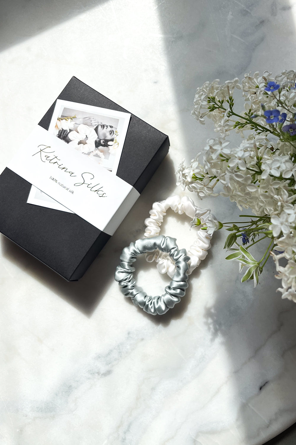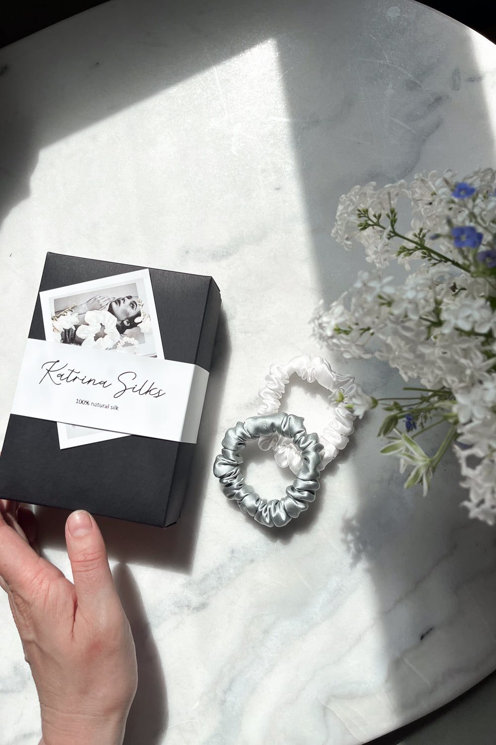 Zīda matu gumiju komplekts "summer" - 2 S izmēra matu gumijas White Pearl & Misty Blue