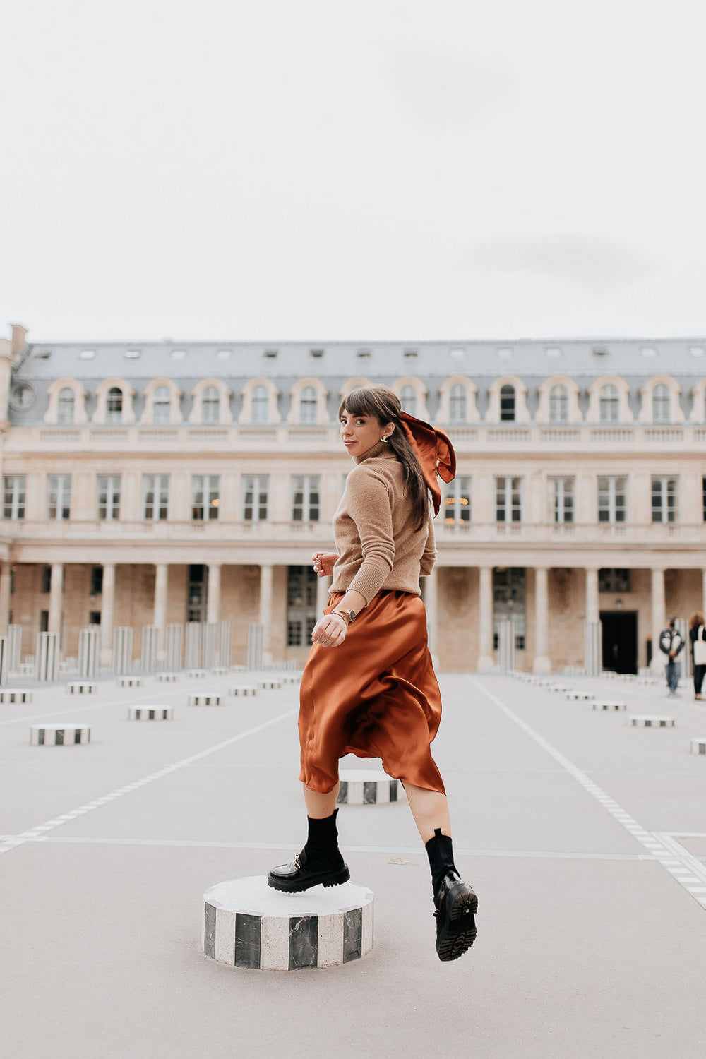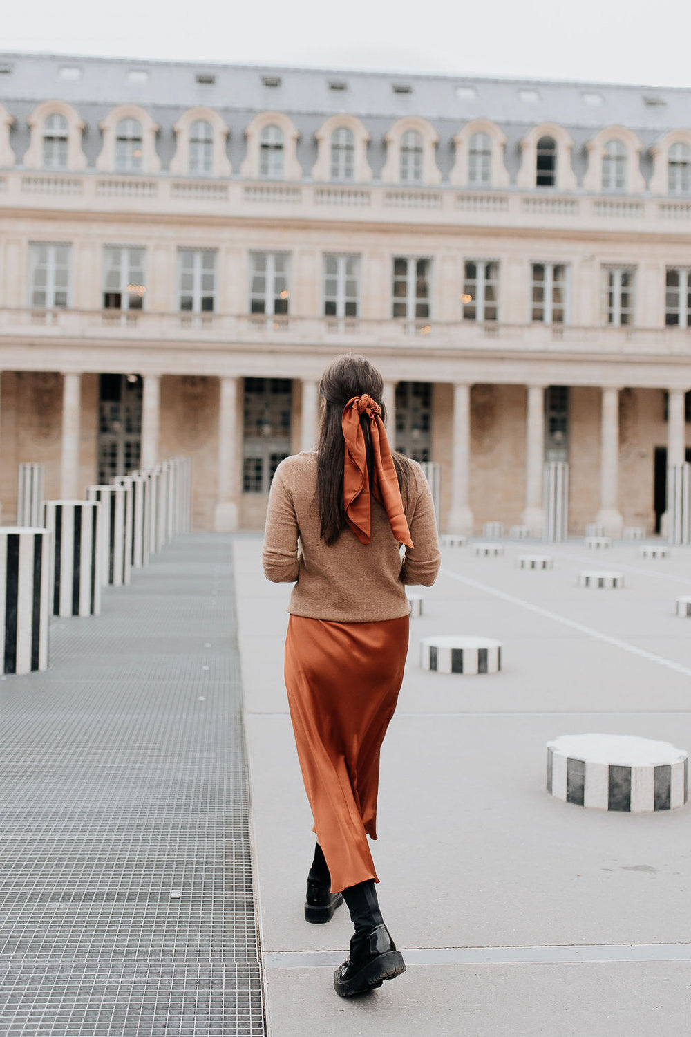 Kvadrātveida lakatiņš no augstākās kvalitātes dabīgā zīda kanēļa krāsā. Ir daudz veidu, kā to valkāt — ap kaklu, matos, uz galvas, ap roku vai pie rokassomiņas.